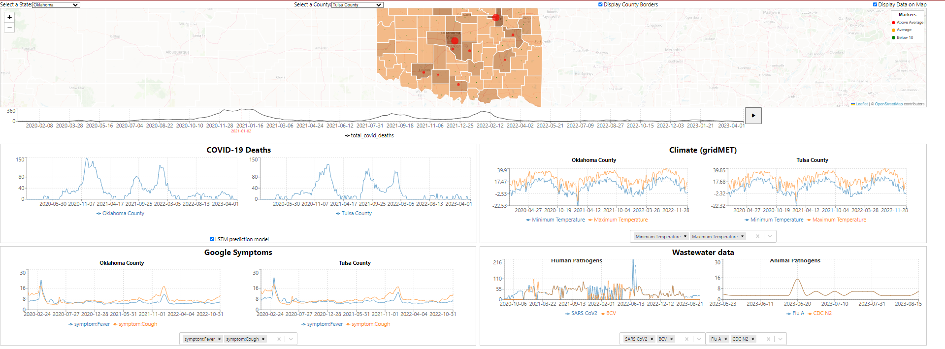 The goal of the environmental surveillance team is to collect environmental measurements that can be integrated with data on pathogens, vectors, and hosts and develop predictive models and identify transmission hotspots for specific diseases. We have built a database of environmental variables obtained from multiple sources, including Oklahoma Mesonet ground-based weather stations, GridMET meteorological grids, and satellite Earth observations. We have also prototyped a system for watershed monitoring that involves testing river water samples for human and animal pathogens throughout Oklahoma. These data have been incorporated into the PIPP dashboard and are being used to analyze the relationships between meteorological variables and COVID-19 outbreaks.