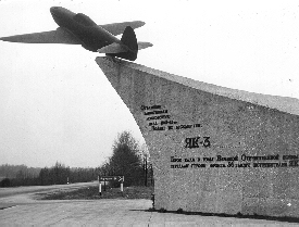 A YAK-3 WWII fighter memorial stands above the Berlin-Moscow highway. The small roadsign says "Borodino 26km." Borodino was the decisive battleground where the Russians defeated the Army of Napoleon near Moscow (Gary Thompson).