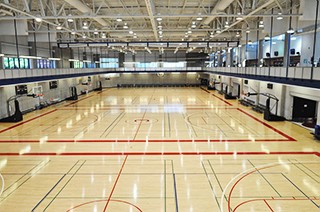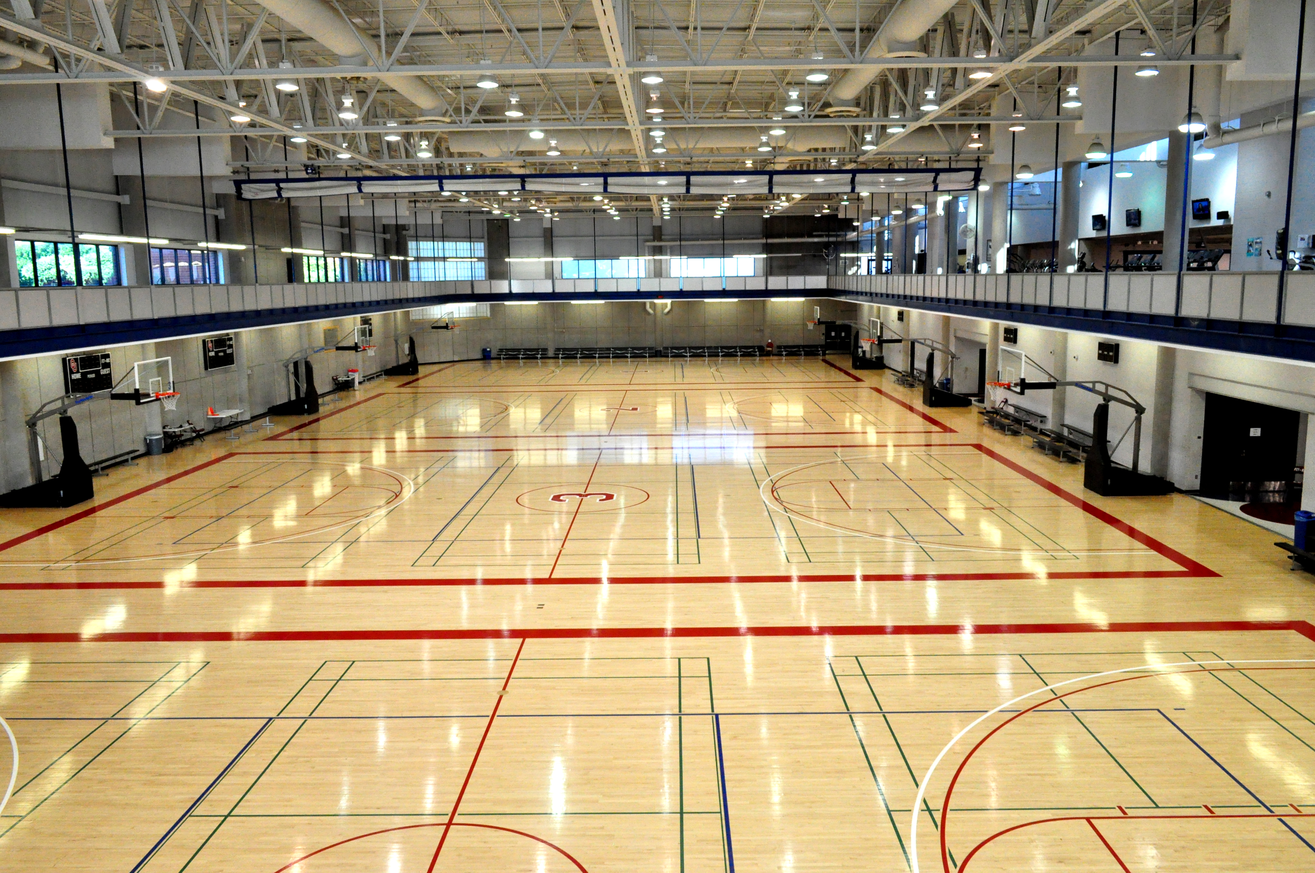 The Sarkeys Fitness Center features eight basketball/volleyball/badminton courts, four racquetball courts, a 1/6th mile indoor track, one large multi-purpose activity room, two weight room areas, a large cardio room with mounted flat-screen TVs, a climbing wall, and a personal training room