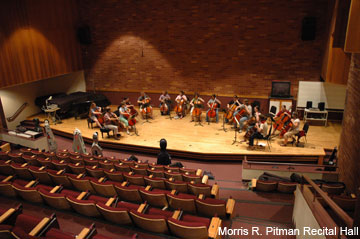 The Paul F. Sharp Concert Hall provides seating for 1,018 patrons to enjoy the remarkable acoustics and architectural beauty of this Prairie Gothic style performance space. The smaller Morris R. Pitman Recital Hall reflects many of the same architectural details of the Paul F. Sharp Concert Hall and creates an intimate environment for 125 patrons to enjoy faculty and student chamber music recitals and lectures.