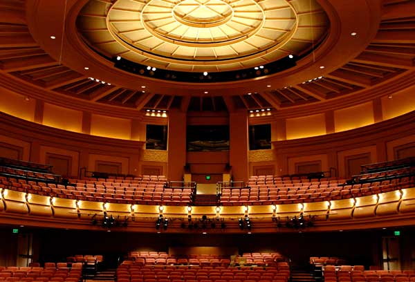 The balcony seating is extended along the side walls of the 85' wide hall as shown in the image above. The wall surfaces of the concert hall are set at irregular angles to control sound reflections within the room. As the main orchestra floor seating rises up towards the back of the hall, the staggered seating affords every patron both an unobstructed view of the performance area as well as "the perfect seat" from which to enjoy an orchestral concert or choir offering.