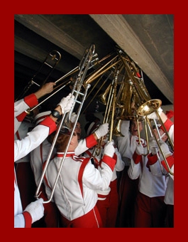 Everyone is excited and standing up now, and it's crowded. Some of us are jumping up and down, and some are banging their plumed shako hats against everyone else's. The trombone players scrape their horns against a concrete beam stenciled with the simple word "PRIDE," while the saxophones work themselves into a wild frenzy with their instruments raised overhead. Those at the end of the tunnel keep glancing outside at the drum line, waiting for them to step off from the north goal line and begin the cadence. It's still noisy, and the massive crash of percussion can barely be heard in the darkness. Everyone screams and yells, but it soon becomes quiet as the band listens for twenty four counts of solo snare taps. Now on the fifteen yard line, the drums explode into a quick cadence as the loudspeakers announce the "Prrrride of Oklahoma!" We run out of the dim tunnels into the stadium full of 83,000 Sooner fans and realize how much louder it is out here, especially with the RUF/NEKS shooting their guns off a only few yards away. Suddenly the cadence stops, everyone's horn snaps up and the full 300-piece band projects in full volume the collective Sooner Spirit with its signature version of "Oklahoma!"