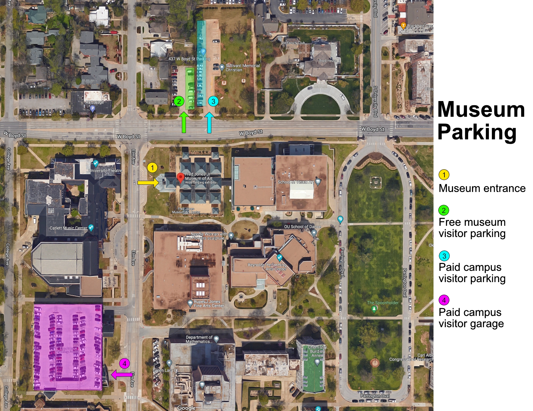 The museum offers free visitor parking across the street from the north side of the museum off Boyd Street. Signs indicate which spaces are free for museum visitors. Refer to the map below for which spaces are reserved for museum visitors. Please call us at (405) 325-4938 if you have further questions about parking.