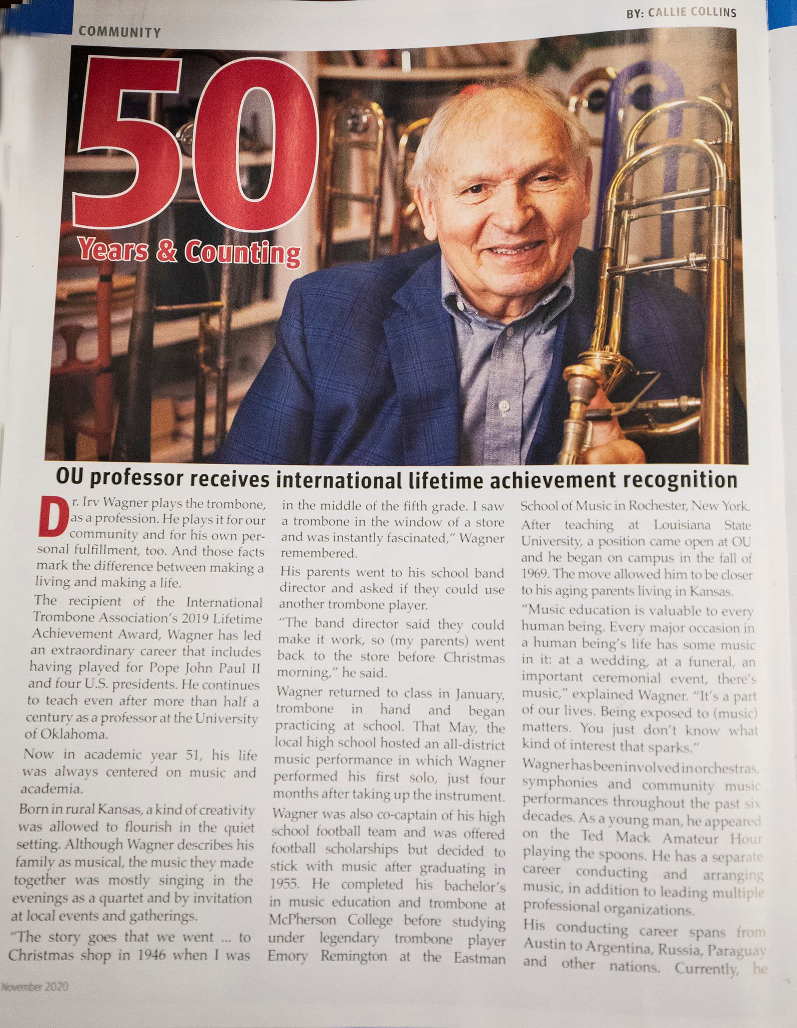 More great press for OU School of Music trombone professor Dr. Irv Wagner!  Thank you to Callie Collins for this wonderful feature article in the most recent issue of Boyd Street Magazine!
