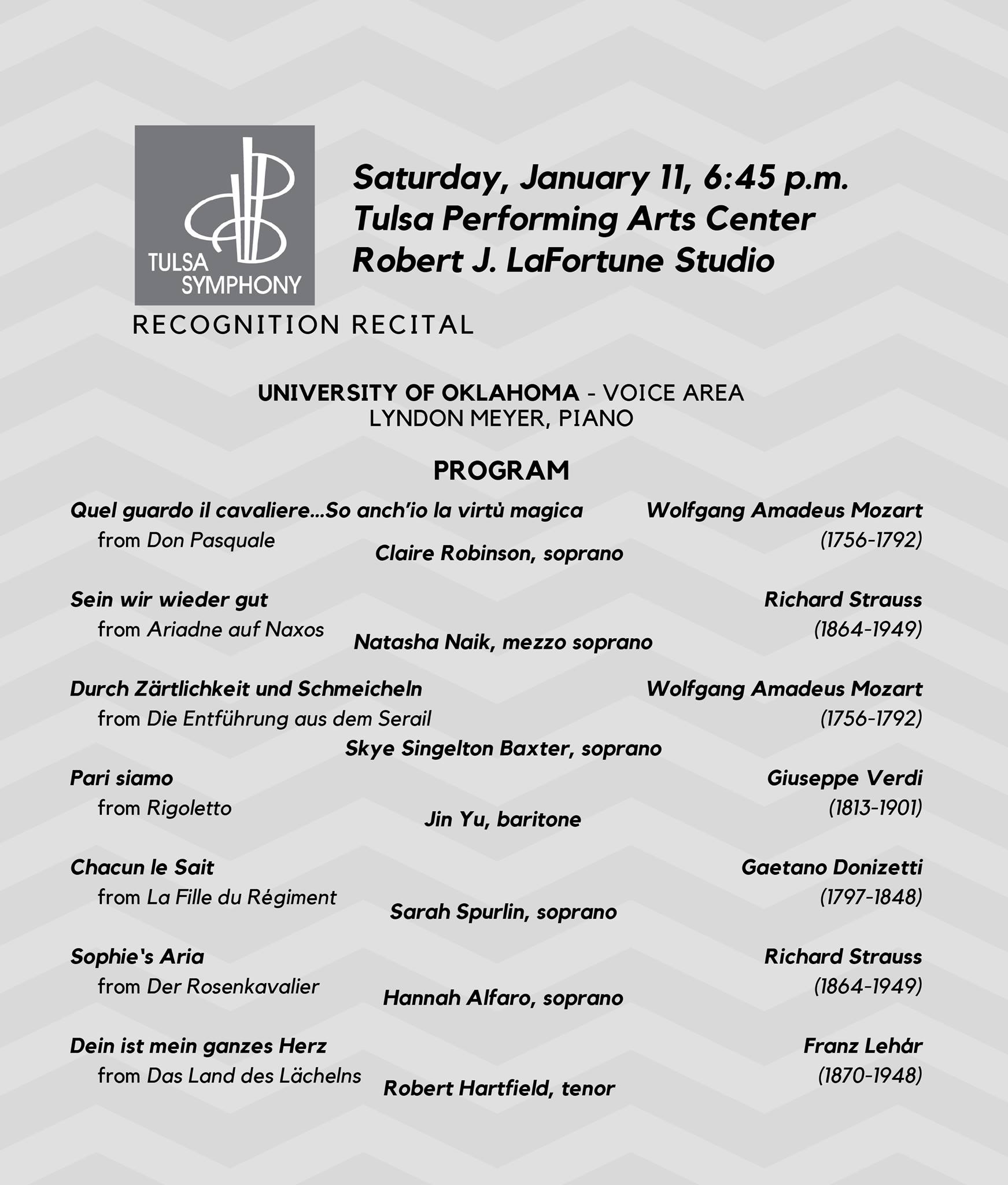 OU School of Music voice students Claire Robinson, Natasha Naik, Skye Singleton, Jin Yu, Sarah Spurlin, Hanna Alfaro, and Robert Hartfield performed a recital prior to Sarah Coburn's performance with the Tulsa Symphony. Congratulations to these outstanding students, and to our outstanding OU School of Music vocal arts faculty!