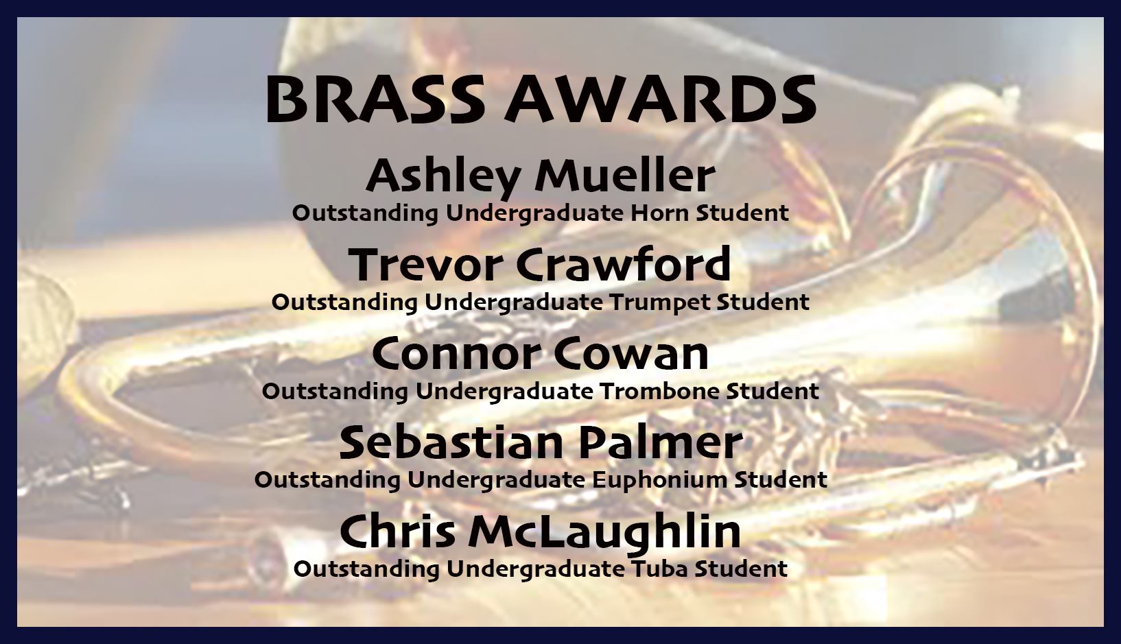 Congratulations to this year's undergraduate brass area award recipients: Ashley Mueller, Trevor Crawford, Connor Cowan, Sebastian Palmer, and Chris McLaughlin!