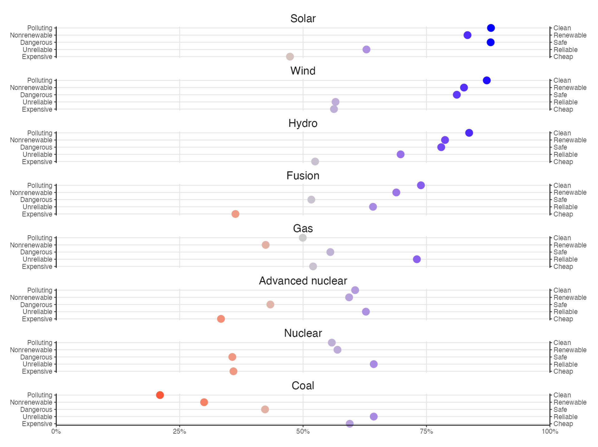 There is a growing recognition that developing and deploying these new energy sources and infrastructure is not simply a technical challenge; it requires solutions that are socially and politically tenable. Public perceptions can boost or dampen prospects for energy options. For example, views of whether a type of energy is clean or polluting, safe or dangerous, finite or renewable, reliable or unreliable, and cheap or expensive can all affect public support for investing in and using that energy source. IPPRA provides insights into these public perceptions through survey research, asking US residents how they perceive the attributes of an array of energy sources, as shown in Figure 1.