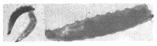 Figure 2. Observation of GFP expressing larvae: At left: 3rd instar larvae. upper: control, lower: Bloomington stock 4559 (FM7i-pAct-GFP). At right: P{Gal4} enhancer/UAS-GFP 3rd instar larva: GFP Expression is visible in the imaginal discs and salivary glands. |