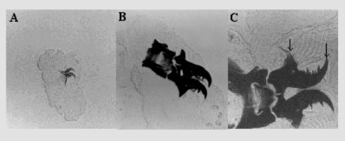 Flies were allowed to lay eggs for periods of 30 minutes, on banana agar-medium seeded with live yeast to induce egg laying. Cultures were kept in an incubator at 25˚C and synchronized by removing all larvae that were present in the medium 24 hours later. The mouth hooks of first and second instar larvae were either dissected or obtained from the media during molting. Mouth hooks from third instar larvae in their wandering stage were not dissected but cleared by boiling in KOH for 3 minutes. All samples were mounted in glycerol and the hooks were measured from the tip to the base with an ocular micrometer as indicated by the arrows in Figure 1C. Most eggs hatched at 26.5 ± 0.5 hrs. The first, second and third instars last approximately 22 hrs, 28 hrs, and 74 hrs, respectively. The first molt occurs at 49 ± 1 hr after egg laying (AEL); the second molt at 77 ± 2 hr AEL. Pupation starts at 151 hr AEL. There can be much variation at this stage unless larvae are synchronized during the second molt. The adult emerges 12 days after egg laying. The mouth hooks of first instar larvae are small (26 ± 1.47 µm) with one or two sharp teeth in the middle of the hook (Figure 1A). Most larvae have only one tooth. Mouth hooks of second instar larvae are nearly double in size (44 ± 1.83 µm) and have only one prominent sharp tooth preceded by two to four middle sized teeth (Figure 1B). Third instar larvae have 6 to 12 teeth showing a more complex pattern. The size of the teeth increases with age. At the wandering stage, most larvae have two prominent sharp teeth with several middle-sized teeth between them, and in front of the first sharp tooth, towards the tip of the hook, there are several minute teeth (Figure 1C). The size of the hooks is 81 ± 7.45 µm. As in D. melanogaster and other species, the number of teeth in the mouth hooks of D. dunni showed no overlap from one instar to the next.