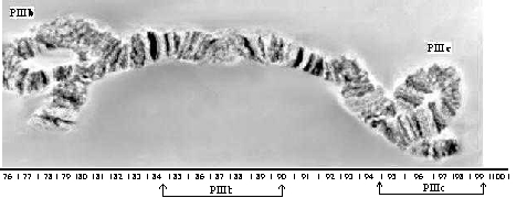 Figure 1. The inversions PIIIb and PIIIc, and their breakpoints established on the chromosome map presented by Cavalcanti (1948) |