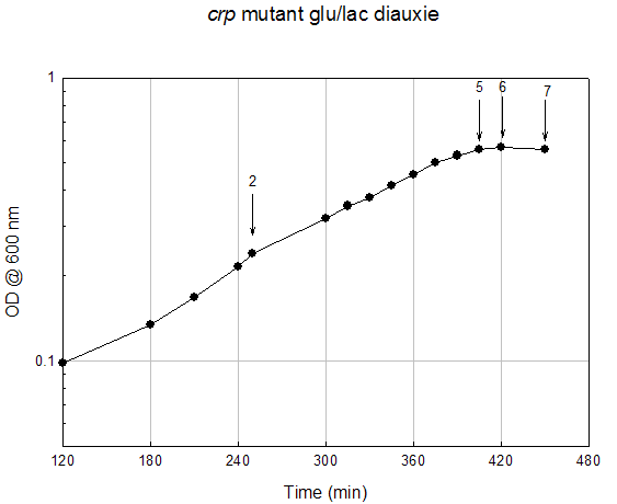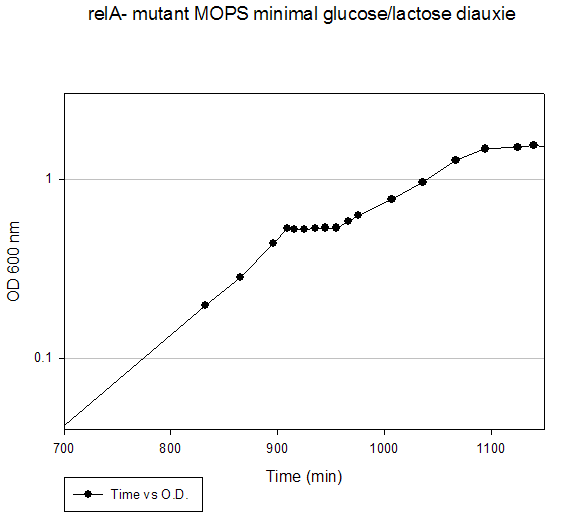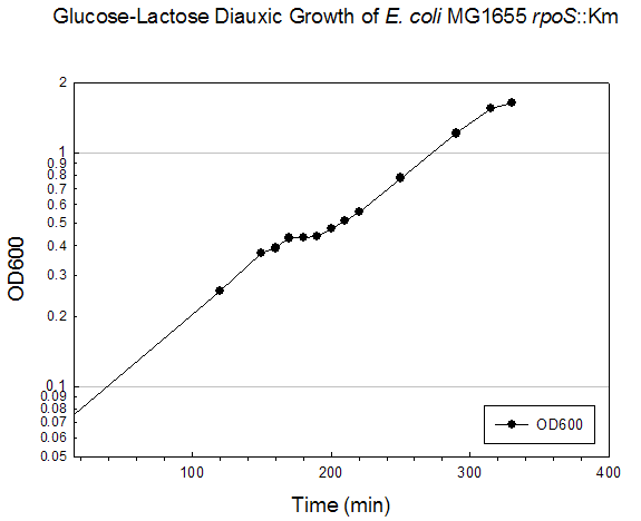 Time (min) A600 Timepoint 120 0.257 rpoS tp1 150 0.372 rpoS tp2 160 0.391 rpoS tp3 170 0.432 rpoS tp4 180 0.434 rpoS tp5 190 0.438 rpoS tp6 200 0.472 rpoS tp7 210 0.513 rpoS tp8 220 0.561 rpoS tp9 250 0.78 rpoS tp10 290 1.21 rpoS tp11 315 1.55 rpoS tp12 330 1.63 rpoS tp13Crp Mutant Diauxie Time (min) A600 Timepoint 0 0.054 none 60 0.078 none 120 0.098 none 180 0.134 none 210 0.168 none 240 0.216 none 250 0.24 crp tp2 300 0.319 none 315 0.353 none 330 0.378 none 345 0.415 none 360 0.455 none 375 0.503 none 390 0.532 none 405 0.56 crp tp5 420 0.568 crp tp6 450 0.56 crp tp7RelA Mutant Diauxie Time (min) A600 Timepoint 832 0.198 tp1 865 0.283 tp2 896 0.437 tp4 909 0.53 tp5 916 0.526 tp6 925 0.526 tp7 935 0.532 tp8 945 0.535 tp9 955 0.535 tp10 966 0.582 tp11 976 0.626 tp12 1007 0.772 none 1036 0.959 none 1067 1.278 none 1095 1.479 none 1125 1.509 none 1140 1.544 none 1325 1.38 none |