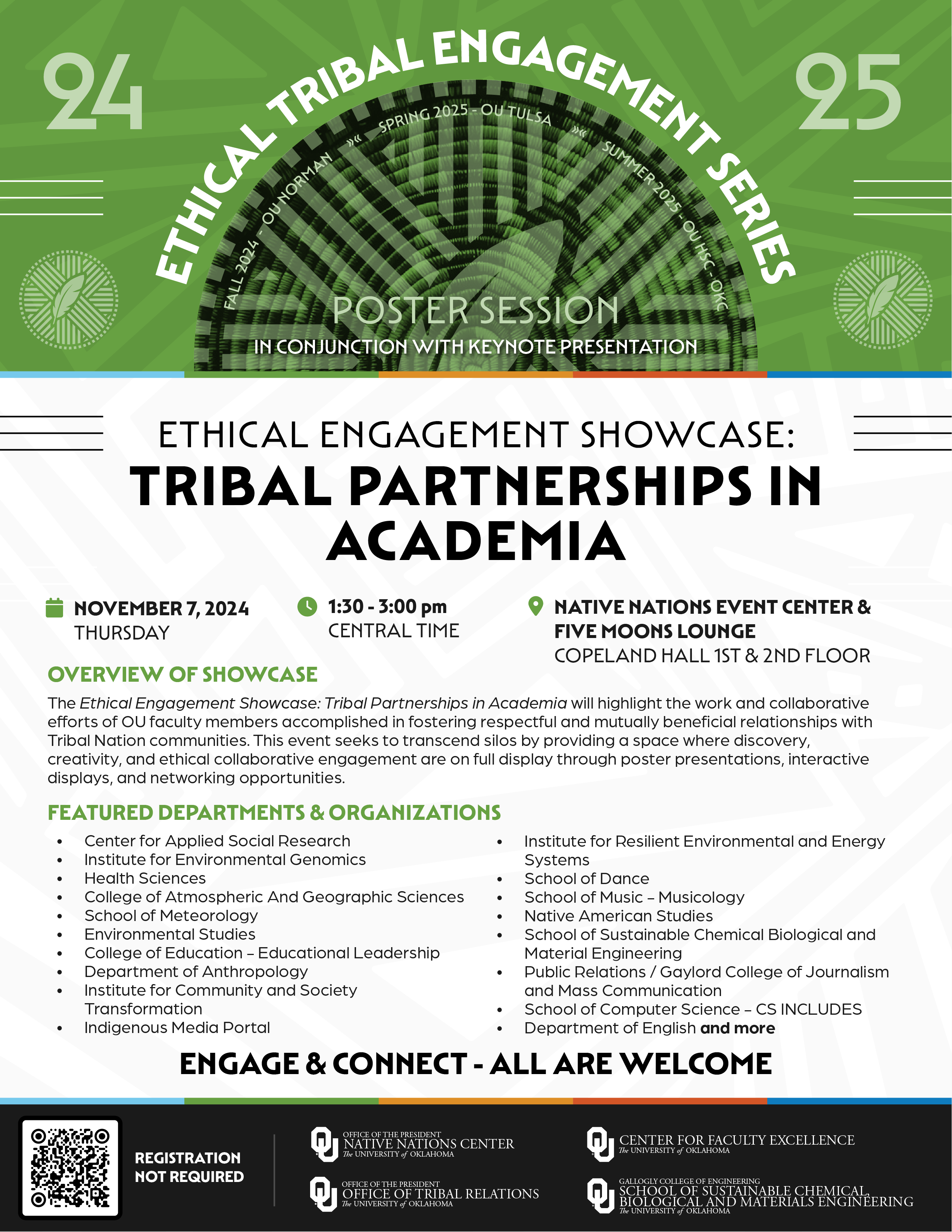 The Ethical Engagement Showcase will highlight the interesting and collaborative ways that OU faculty members partner with Tribal Nations. The event will feature a variety of disciplines, projects, and initiatives that demonstrate effective and ethical engagement with Tribal Nation communities. The Showcase seeks to share experiences and innovative approaches to working with Tribal Nations and aims to foster a deeper understanding and appreciation of ethical tribal engagement within OU's academic community. It is designed for faculty, graduate students, researchers, or campus partners who wish to learn more about working with Tribal Nations or seek to expand their existing efforts.