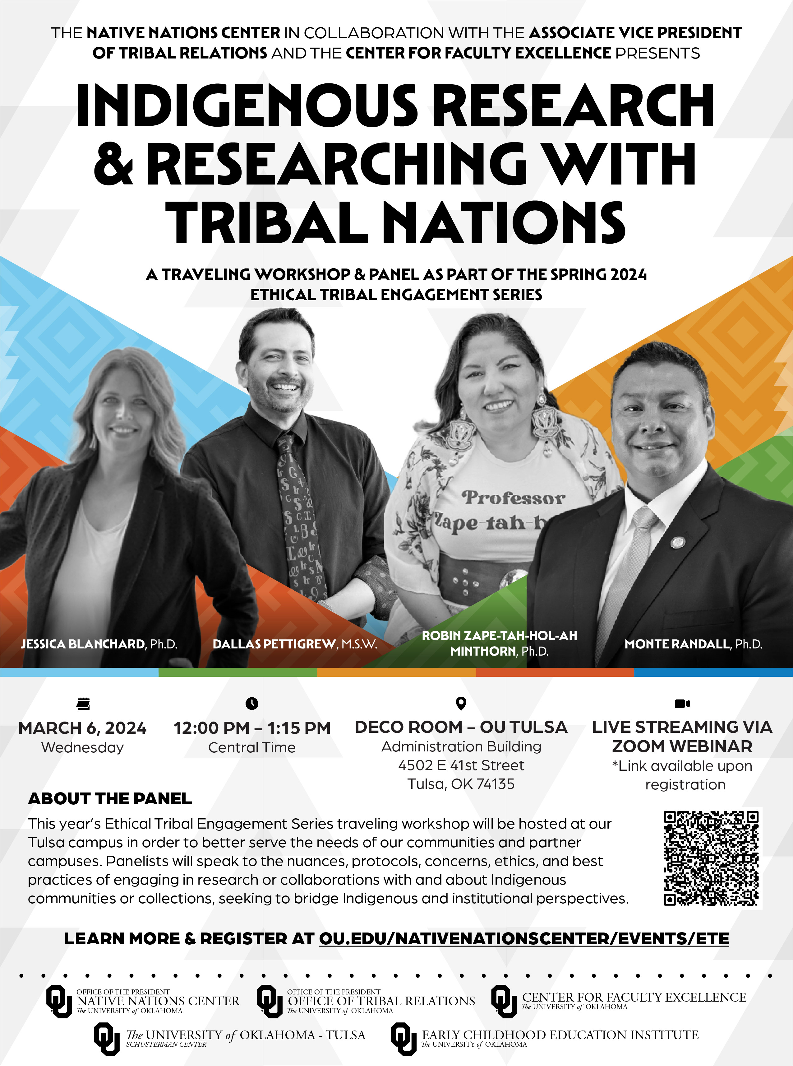 This year’s “Ethical Tribal Engagement Traveling Workshop #3: Indigenous Research and Researching with Tribal Nations” will be hosted at our Tulsa campus in order to better serve the needs of our communities and partner campuses. Panelists will speak to the nuances, protocols, concerns, ethics, and best practices of engaging in research or collaborations with and about Indigenous communities or collections, seeking to bridge Indigenous and institutional perspectives.