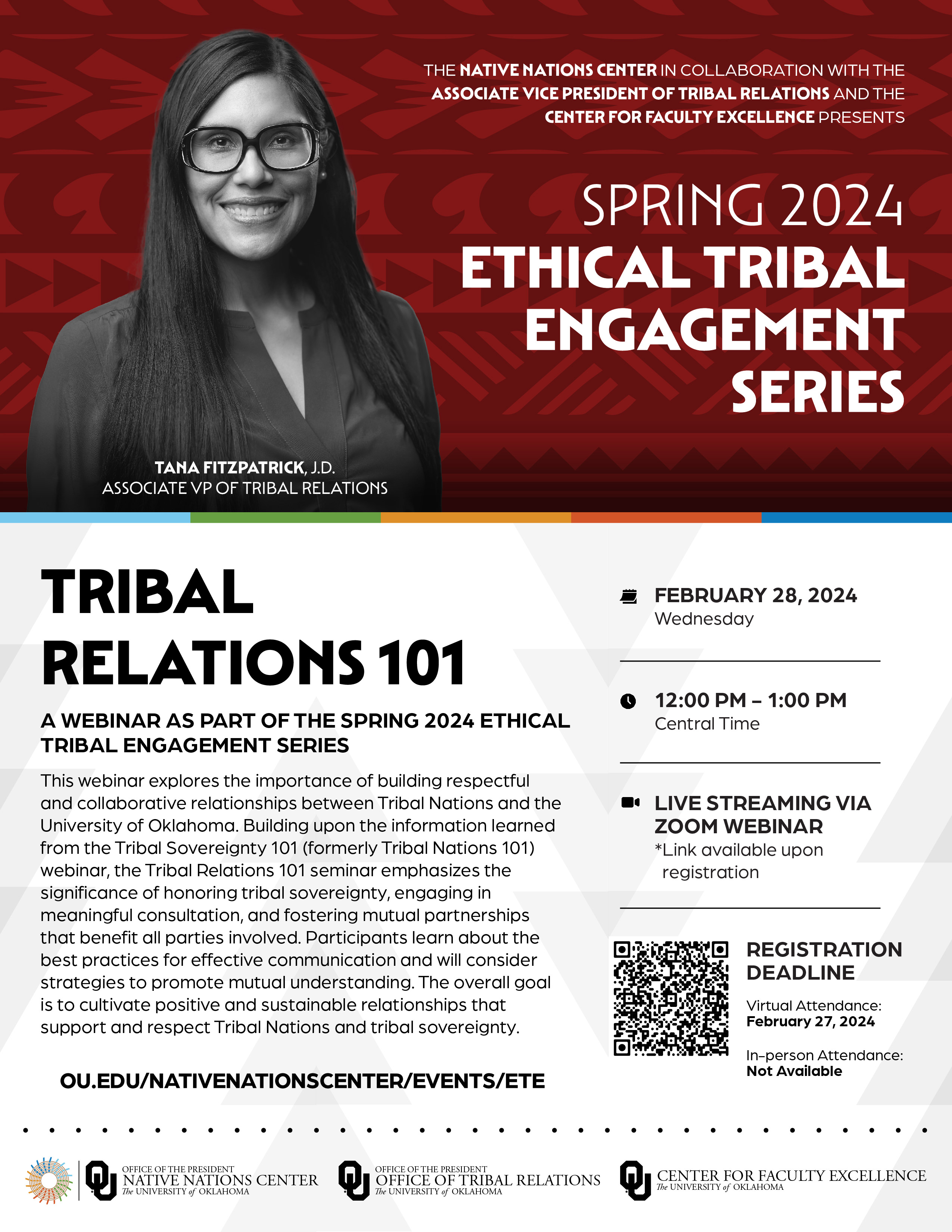 The Tribal Relations 101 webinar explores the importance of building respectful and collaborative relationships between Tribal Nations and the University of Oklahoma. Building upon the information learned from the Tribal Sovereignty 101 (formerly Tribal Nations 101) webinar, the Tribal Relations 101 seminar emphasizes the significance of honoring tribal sovereignty, engaging in meaningful consultation, and fostering mutual partnerships that benefit all parties involved. Participants learn about the best practices for effective communication and will consider strategies to promote mutual understanding. The overall goal is to cultivate positive and sustainable relationships that support and respect Tribal Nations and tribal sovereignty.