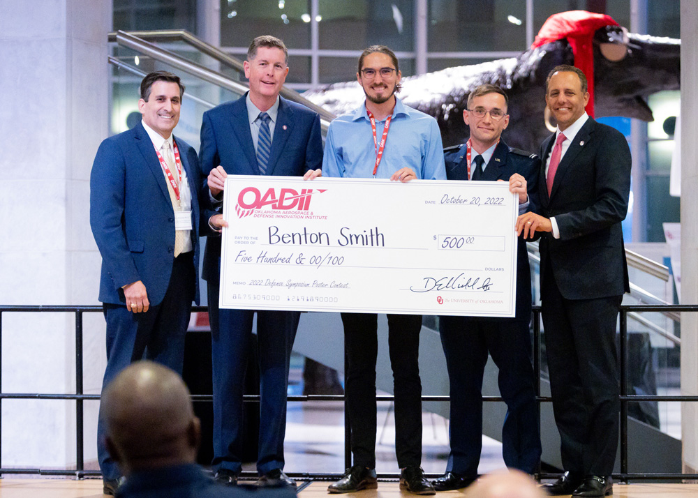 Three University of Oklahoma students received cash prizes from the Oklahoma Aerospace & Defense Innovation Institute (OADII) Student Poster Competition. The winning research posters were selected by a panel of judges during the inaugural OU defense symposium held Oct. 20, 2022 at the Sam Noble Oklahoma Museum of Natural History.