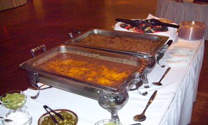 The Nacho bar comes with chicken and beef fajita meat, Spanish rice & refried beans and multi-colored tortilla chips.
