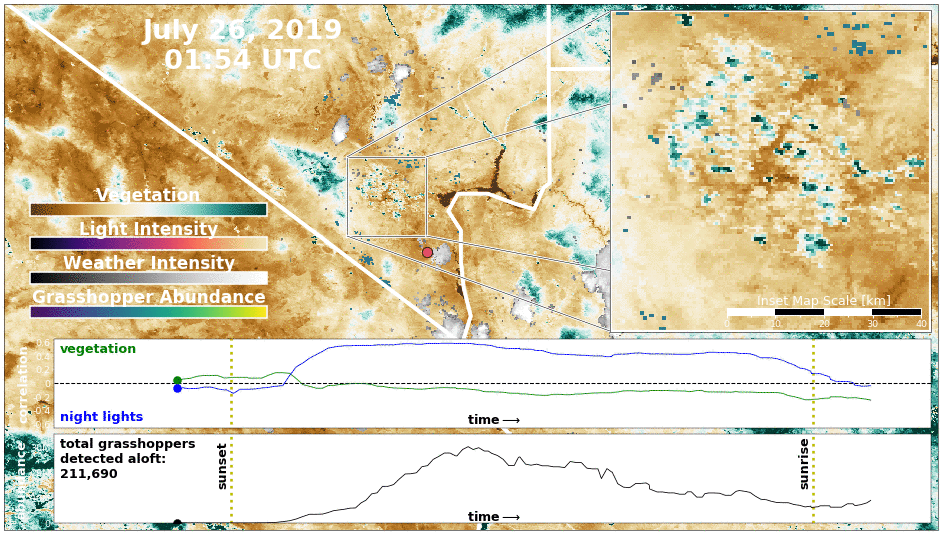 Analyzing weather surveillance radar in June and July 2019, Tielens found that some 45 million grasshoppers – a “biblical plague” – took flight during the outbreak peak, concentrating over city lighting such as the Las Vegas strip. The group also found daily movement cycles of dusk ascent from vegetated habitat toward lit urban areas after dark.