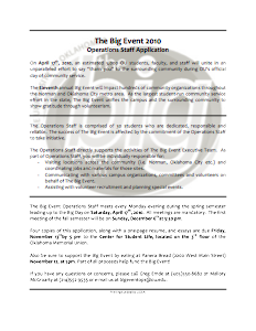 BIG EVENT EXECUTIVE TEAM APPLICATIONS ARE AVAILABLE NOW. Applications are due Friday, September 10, 2010 at 4p.m. to Kari Dawkins in Leadership Development & Volunteerism Office (OMU 249). Fill out yours today!