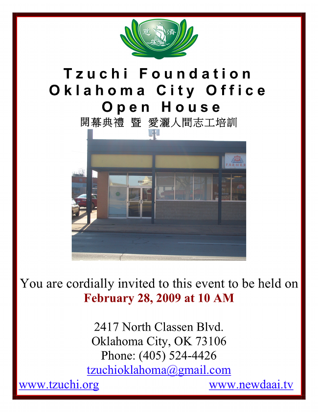 慈濟的 Oklahoma 辦公室將於 2 月 28 日上午 10 時於 Oklahoma City 開幕,並邀請 OU TSA 的會員參與他們的開幕活動,中午並有提供午餐。