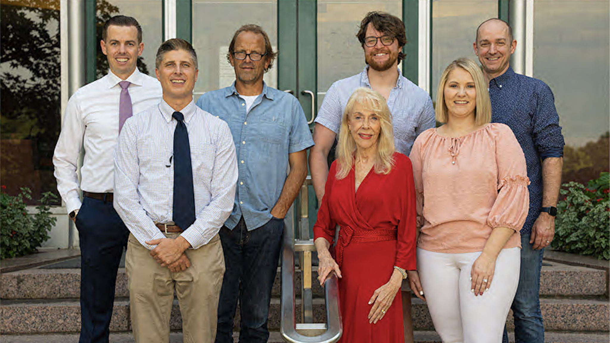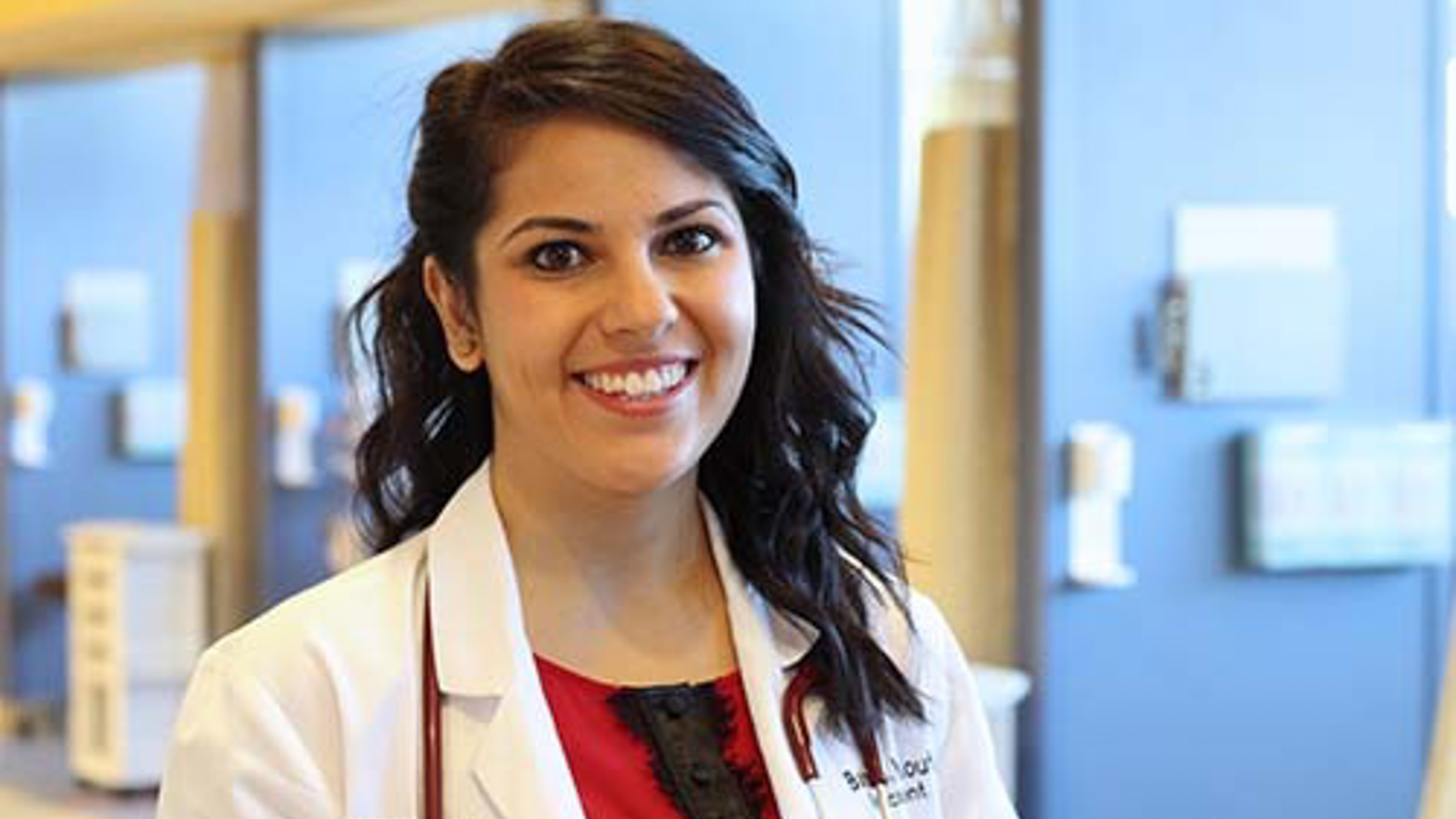 OU-Tulsa PA students in white coats stand in front of a red background with an OU logo on it