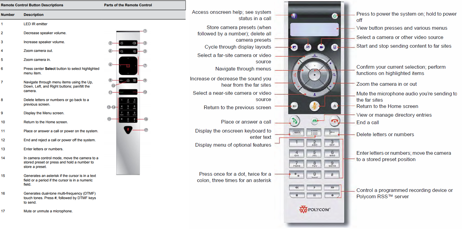 Here is the most common polycom remote you will find on campus with explanations as to what each button does.