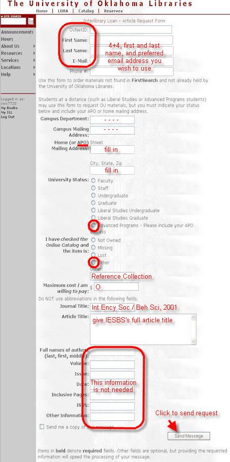 You do not need to fill in a phone number (we doubt seriously that OU Libraries is going to wish to call you overseas, or even in another state, to talk to you about your request: they will simply use email to get in touch with you!). The next section asks you to identify your address: all you need to fill in here is your APO address and your University status (Advanced Programs). Don't offer to pay for this service, because it is available to you at no charge: "0" is the maximum cost you need to be willing to pay! Although the form asks you if you have checked OU's catalog, all Document Delivery would like for you to do is indicate that the source (the IESBS, 2001 edition) is housed in the library's Reference Collection. (It is a 26 volume set that remains on the first floor of the main library--Bizzell Library--for ease of access by on-campus, in-library users. Even though it isn't a Journal Title, Document Delivery asks that you give the title of the encyclopedia here. (We are recommending that you indicate enough of its title that the Document Delivery searchers have no difficulty figuring it out: so something like "Int'l Ency of the Soc & Behav Sciences, 2001 edition" will probably do nicely) The next box is the most crucial: you need to give the title of the article in the IESBS that you wish to have access to. From your searching in the "free" abstracts-only, try-it-out version of IESBS, you will have identified the title of an article you wish to have access to. Fill the Article Title box in with that information. Don't fill out the citation information at the bottom of the form--it isn't really applicable here. That section is focused specifically on bibliographic elements of a journal article citation.