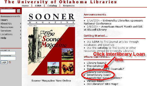 If the full article would be of interest to you, you can proceed to step 2, requesting that OU Document Delivery scan the full article for you and make it available to you (as a PDF file) to have. Here are the steps an Advanced Programs student goes through to leave a request for OU Document Delivery to copy, and make available as a PDF file, an article from the latest (2001) edition of the IESBS, the International Encyclopedia of the Social and Behavioral Sciences. From the OU Libraries top page (seen below), look for the site's Where Can I Find . . . list of links (on the right side of the page) and choose the Interlibrary loan link from it: