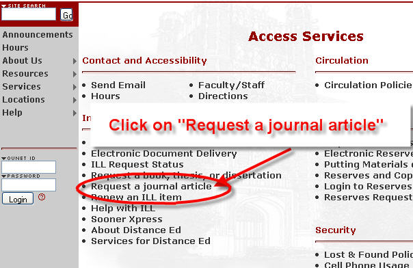 That will take you to the Access Services page, of which the Interlibrary Loan operation is a part. Under the category Interlibrary Loan on that page is the item you are looking for, Request a journal article: