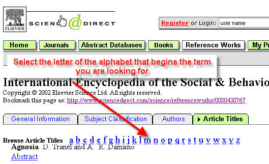 3. On the resultant page, select the letter of the alphabet that matches your key word. We might, for example, be interested in an article about Mnemonics, so we would click on the "M" to browse through a list of articles beginning with "M"