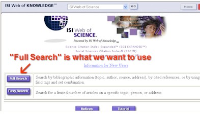 As indicated in the graphic above, you should next click on the "Full Search" button. That takes you to another display, where you will indicate that you are going to be using the part of the ISI database that specifies its social sciences database, "Social Sciences Citation Index," and that you wish to carry out a "Cited Ref Search"-- a cited reference search.