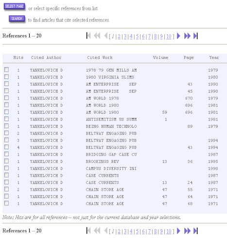 What this expression tells the ISI system is to look for all cited references that have the author whose last name is "yankelovich" and whose first name begins with a "d." You see, ISI doesn't construct author names in the more standard format of last name, comma, first name, (and sometimes) middle name or initial. Instead, it uses last name, a space, and a first initial, (and sometimes) a middle initial too. So by using the asterisk (*), we are denoting truncation or the "wild-card symbol" of any other letter that might occur in authors' names after the "d." At any rate, what we get as a response from the Web of Science system is several pages of results that all fit our search specification. The first page of the results looks like this: