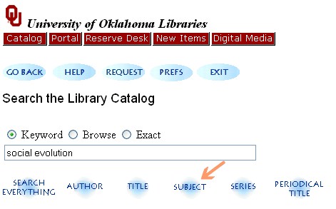 The second thing is quite easy to do as well, if you remember to go back to a blank search form and type in, instead of a title, the subject heading you are looking for, then clicking on the "subject" button (instead of the "title" button). When you do that for the subject heading, say, "social evolution," it will look like this: