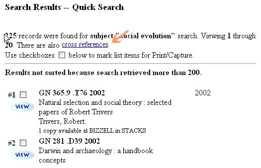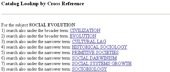 Now, however, look carefully at what WebCat returns to you when you click on a particular subject heading associated with a book. For the first subject heading in the Diamond record, social evolution, we would get a lengthy list of several hundred books with that subject heading, but beginning at the top of the listing with a note that says "there are also cross references" to this subject heading. That is what we are looking for.