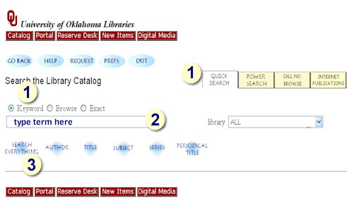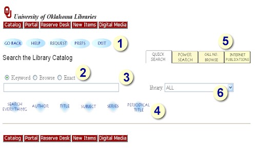Before we get started, take a look around the basics of the WebCat screen. We will discuss the various uses in this tutorial, so for now just familiarize yourself with their locations. By default, when you enter WebCat you are taken to the Quick Search screen.