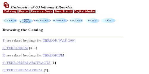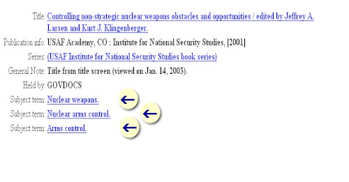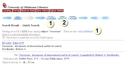 On subject headings, please don't forget about the listing of subject headings under each record. They have links that allow you to quickly find all records that have that particular subject heading associated with them. That differs from the Blue Bar "Cross Reference" button, which takes you to a display of the broader and narrower relationships among subject headings, based on the subject heading you entered for searching.