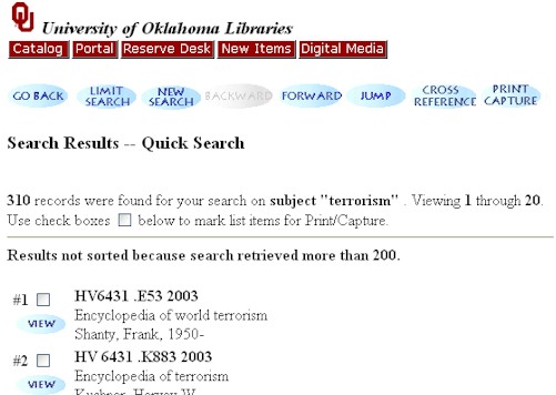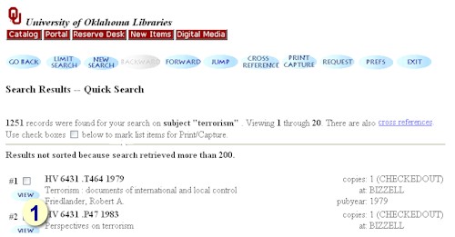 The result of a search is the top level of two result screens. The first level, the higher level, is the Results List screen, which gives you a little information about each of the items returned in your search specification. Lets say you are interested in the first item in this Results List, the item titled "Terrorism; documents of international and local control." In order to see it displayed, you . . .
