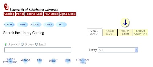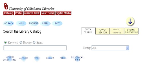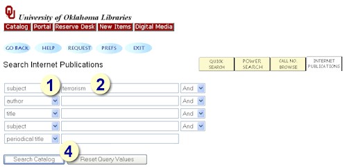 To search for Internet Publications (actually, anything that has an "Electronic Access" note on its catalog record), you will need to click on the search tab Internet Publications . . . Here you can search for electronically accessible (Internet) publications using combinations of keywords or phrases, authors, titles, subjects, and periodical titles using Boolean logic.