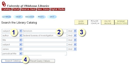 Here you can search for any combination of keywords or phrases, authors, titles, subjects, series and periodical titles using Boolean logic. For each element in your search, select a search box to enter it in and then use the drop-down menu for that search box to indicate what field that word or phrase is to come from